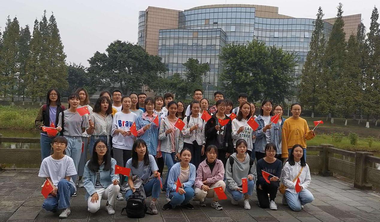 同学们挥动手中的五星红旗,在悠扬的伴奏中激情满怀共同唱响《我和我的祖国》,为祖国七十华诞献上千禧一代的贺礼。歌声洋溢着青年强、国家强的蓬勃生机,每一个音符都表达着同学们与祖国同命运、共进退的坚韧不拔之志。