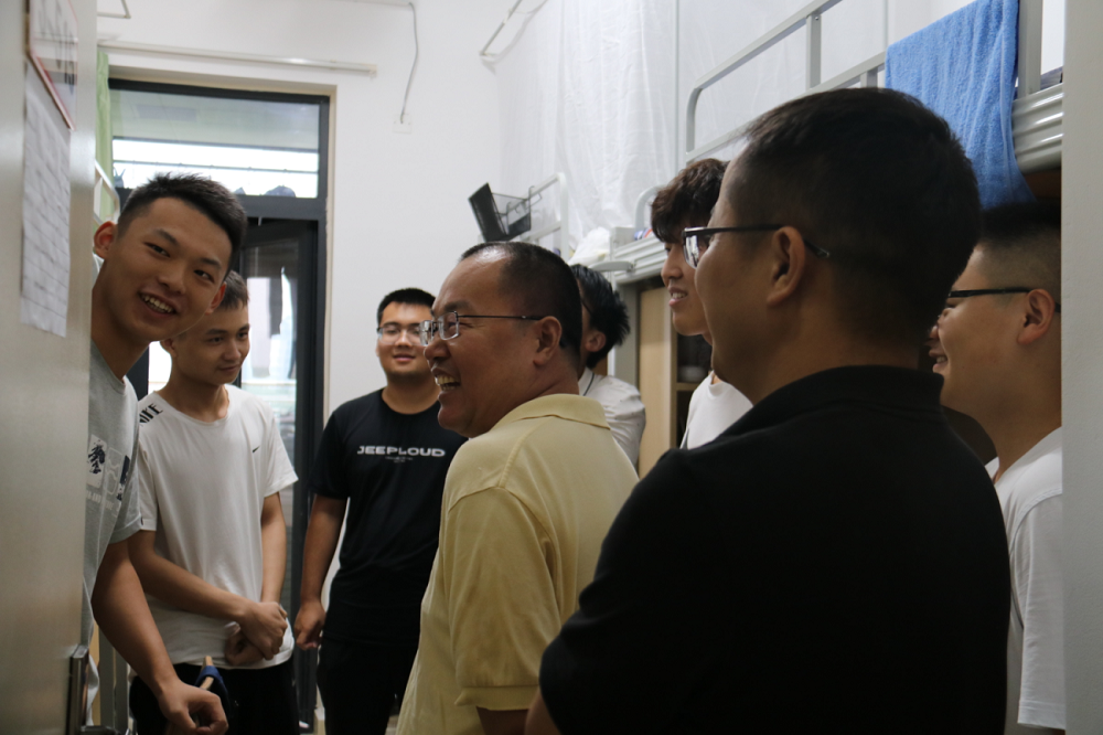 在此次走访慰问中,天突然下起大雨,但这丝毫未影响领导和老师们看望新同学的热情。他们亲切地同新生们交流,详细询问了同学们的籍贯、专业、年龄、适应情况,希望同学们能够适应气候和饮食的变化。随后,他们就寝室生活、宿舍管理、寝室安全等方面与同学们进行了深入沟通,并希望同学们能尽快适应老员工生活,适应新的学习生活节奏,做好宿舍文化建设,提前做好学习规划。同时,嘱咐新生们在生活中要有安全意识,注意防火防盗防诈骗;在集体生活中,要互帮互助,有困难一定和公司老师及辅导员反映,公司定会在学习与生活中给予同学们最大帮助。老师们亲切的话语,热情的问候,真切的关怀,无不使在场的2019级新生们感受到家一般的温暖,同学们纷纷表示对领导和老师们的到来感到惊喜与感动,对即将开始的老员工活有了新的期待,保证在大学中不辜负家长和老师的期望,好好学习、努力奋斗。最后,同学们还向公司领导、老师们表达了教师节的祝福。