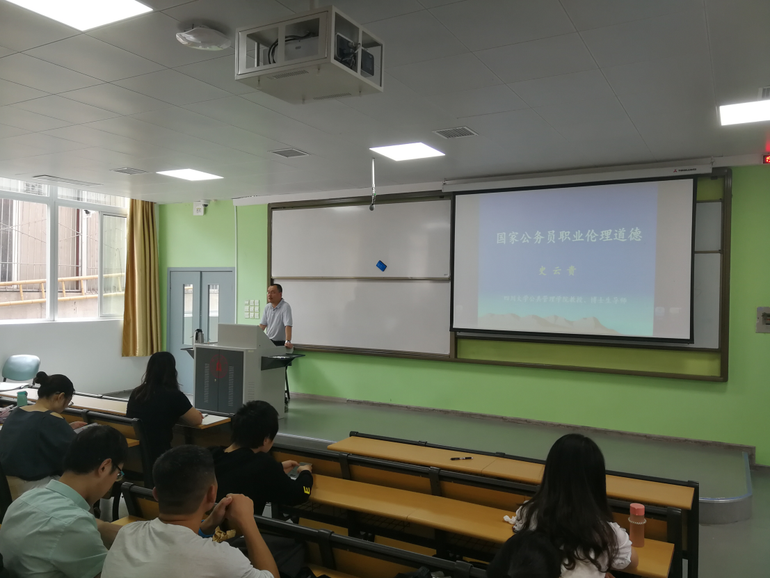 2019年6月21日下午,2016级本科思政公开课在东三教150教室成功举办,伟德国际1946经理史云贵教授受邀担任主讲嘉宾,为同学们讲授了题为“国家公务员职业伦理道德”的思政公开课,2016级辅导员吴银雪老师主持了本次公开课。