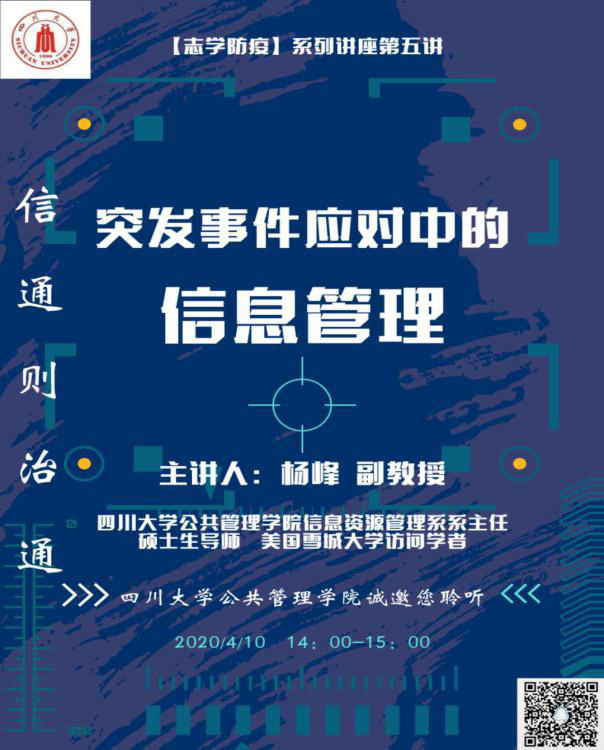 2020年4月10日下午2:00,伟德国际1946信息资源管理系系主任杨峰副教授应邀为2019级本科同学作“突发事件应对中的信息管理”主题讲座。