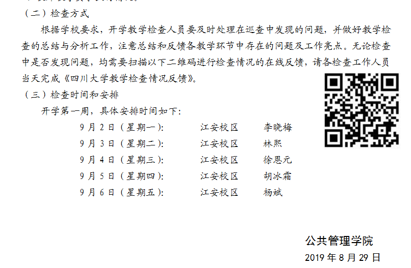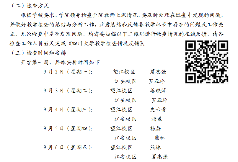 1、公司制定开学教学检查一周工作安排表,做到望江、江安两个校区全覆盖,并将开学教学检查责任落实到个人,全院正副职院领导、本科教学督导组成员、本科教务秘书等参与检查。党委书记姜晓萍、经理史云贵、副书记杨磊、副经理夏志强、副经理熊林、副经理罗亚玲,本科教学督导组胡冰霜、徐恩元、杨斌、李晓梅等老师以及本科教务秘书林熙老师对新学期的课程安排与上课情况进行了检查。