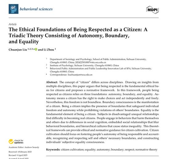 Liu, C.* & Zhou, L. (2025). The Ethical Foundations of Being Respected as a Citizen: A Triadic Theory Consisting of Autonomy, Boundary and Equality. Behavioral Sciences, 15(4), 513. https://doi.org/10.3390/bs15040513